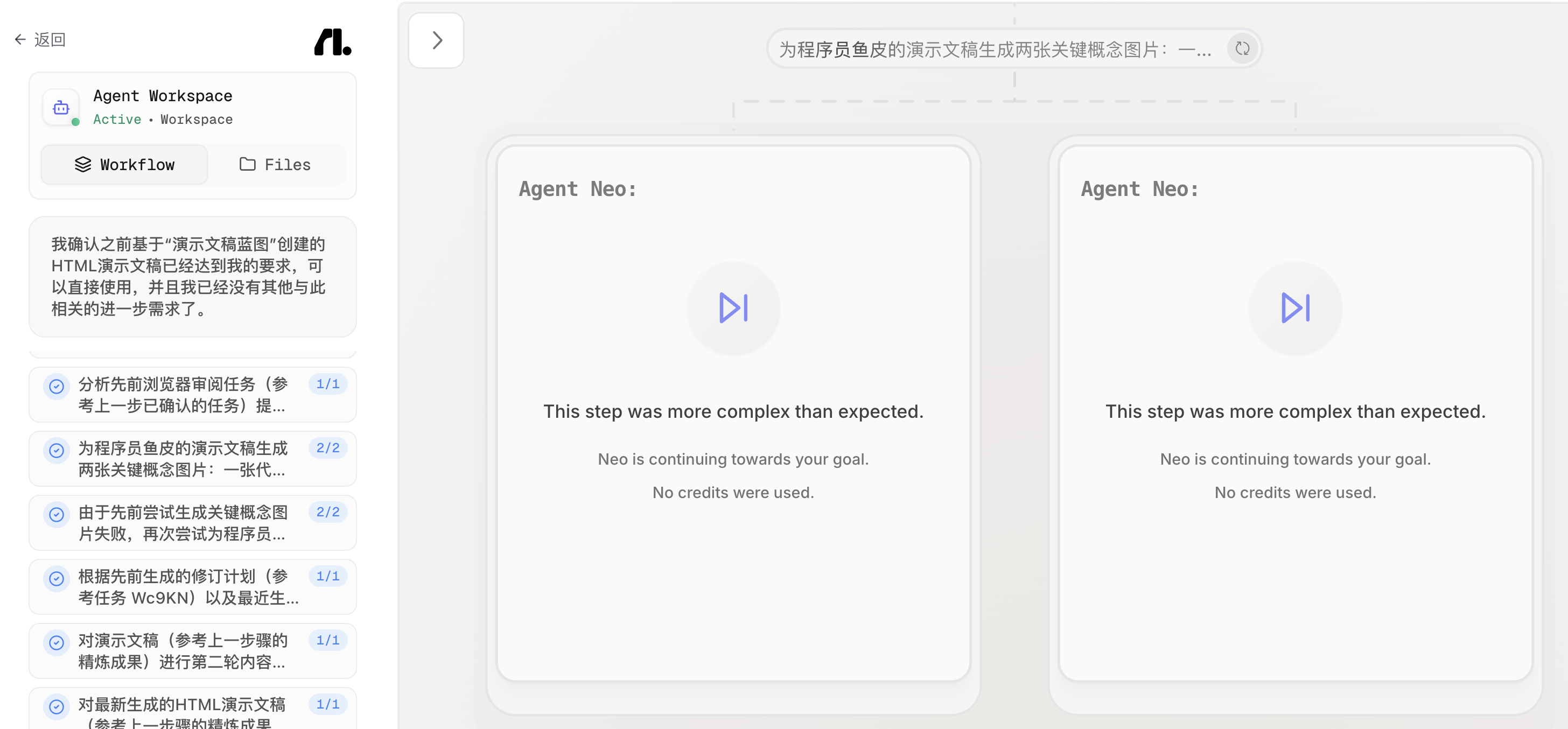 在我看来,AI 完成这个任务时并不是很智能,因为很多页面是可以同时生成的,可以不用一个接着一个按照顺序执行步骤。应该先规划出一条可并行的工作流图,能并行的步骤就并行。