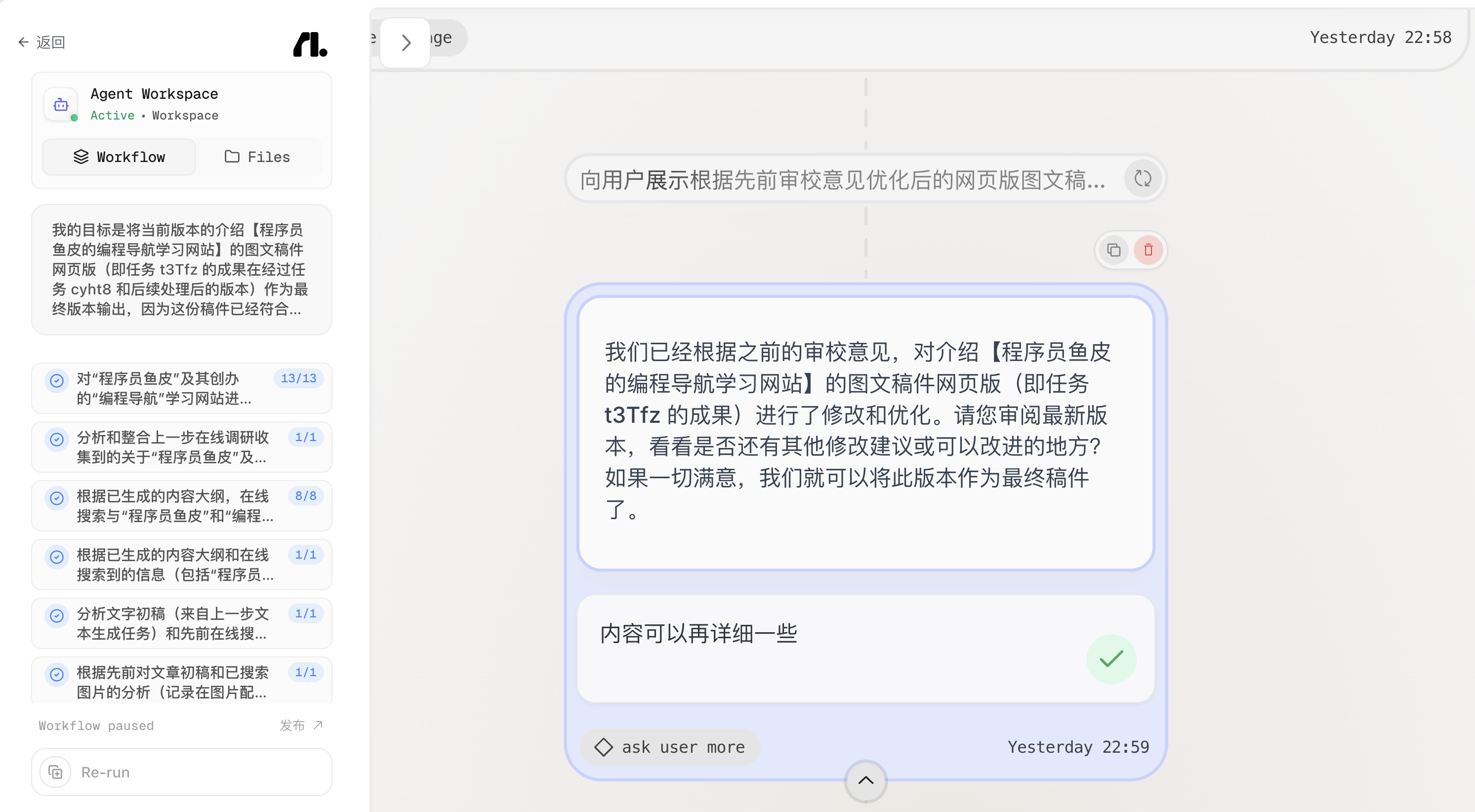 有趣的是,我发现 AI 并不是 “死脑筋”,在执行任务的过程中,他可能会根据情况重新规划步骤;有时还会主动询问用户的意见,能够让我们参与进来,指导 AI 更好地完成任务。