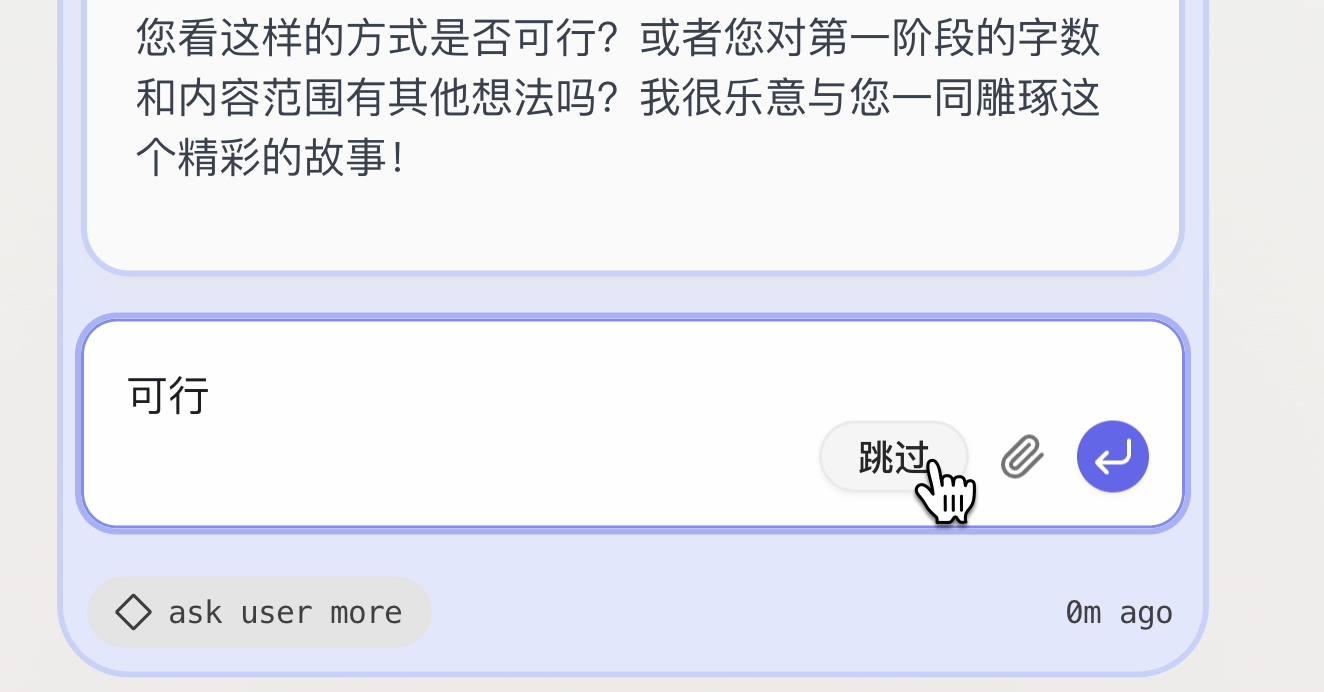 过程就不多介绍了,建议大家每隔一段时间来看看 AI 的工作进度,说不定有时 AI 会主动询问你的建议,你不回答就会一直卡在这里(当然也可以跳过)。