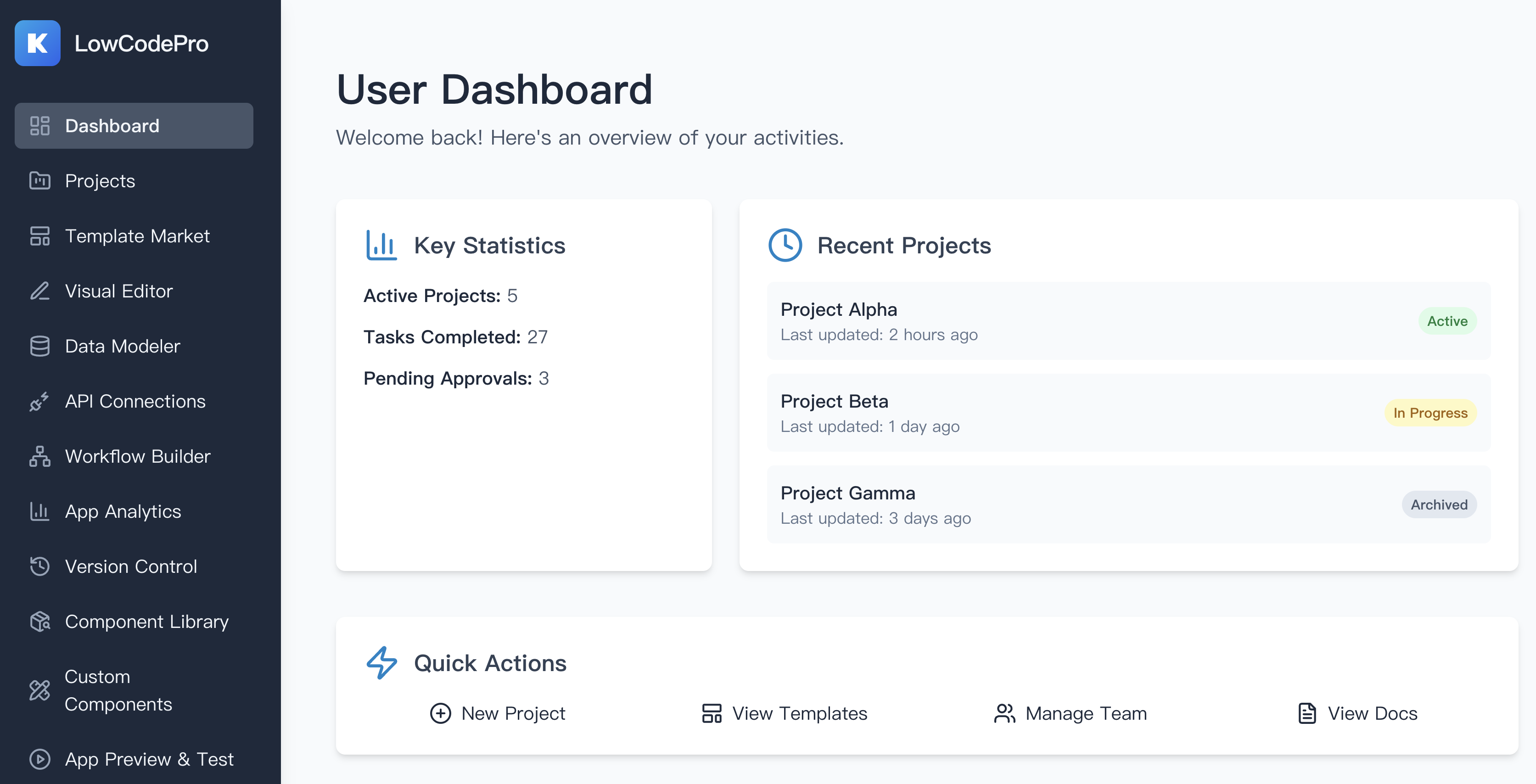 运行下网站看看效果,估计是用的国外大模型,生成的网站纯英文,页面有模有样,符合低代码平台的功能和设计。