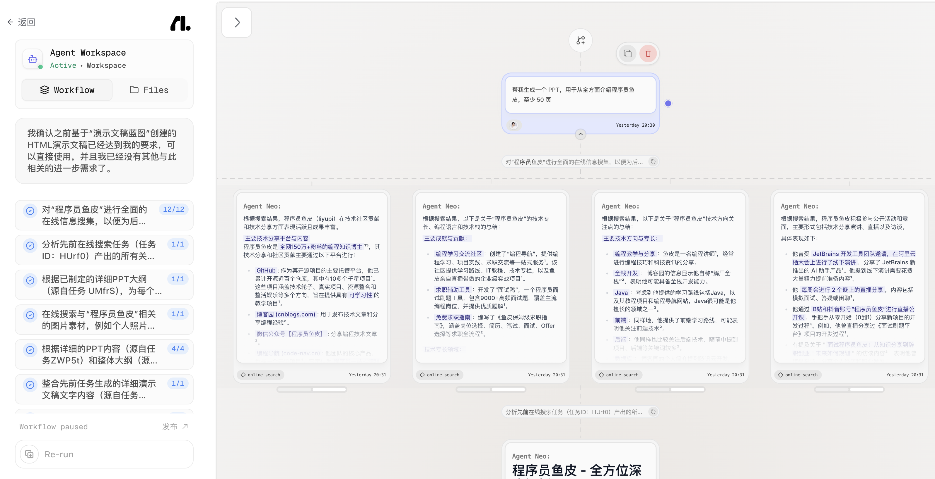 好,我们来执行 PPT 生成任务。这次的 AI 智能体显然更聪明,先同时调用了多个网页搜索工具,从不同的来源搜索到信息,然后再进行整合: