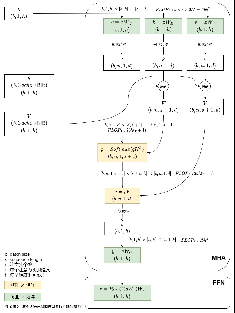 KV Cache是对注意力优化的重要途经。它本质上是文本中每个之前位置的 key 向量和 value 向量的集合。这项技术的出现大大缩减了Self Attention的计算量。这使得在KV Cache技术出现后,可以把推理流程分为prefill和decode阶段(我们会在后文详细分析)。下图就是decode阶段对应的图例。概括地说,其中包含了两种算子: