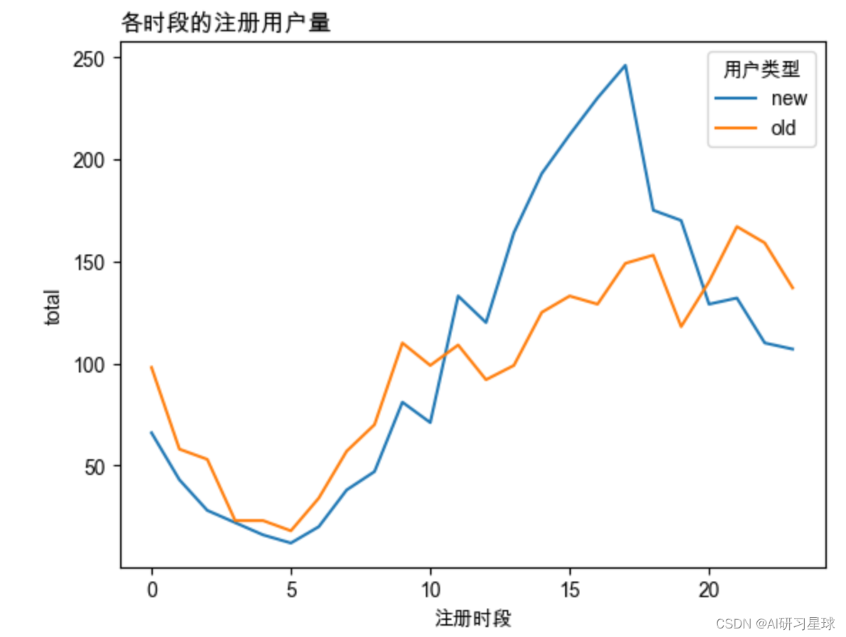 hzc = zc.groupby(['用户类型','注册时段']).用户唯一ID.count().reset_index(name='total')