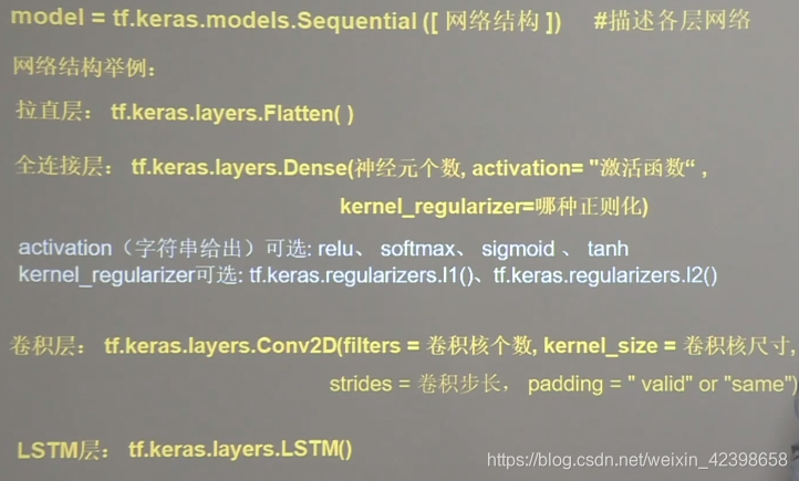 tf.keras.models.Sequential是描述网络层架构的一个api,是顺序的结构即一层一层的描述,但是对于跳跃式的就不行,需要使用自定义层,或者使用类实现 。