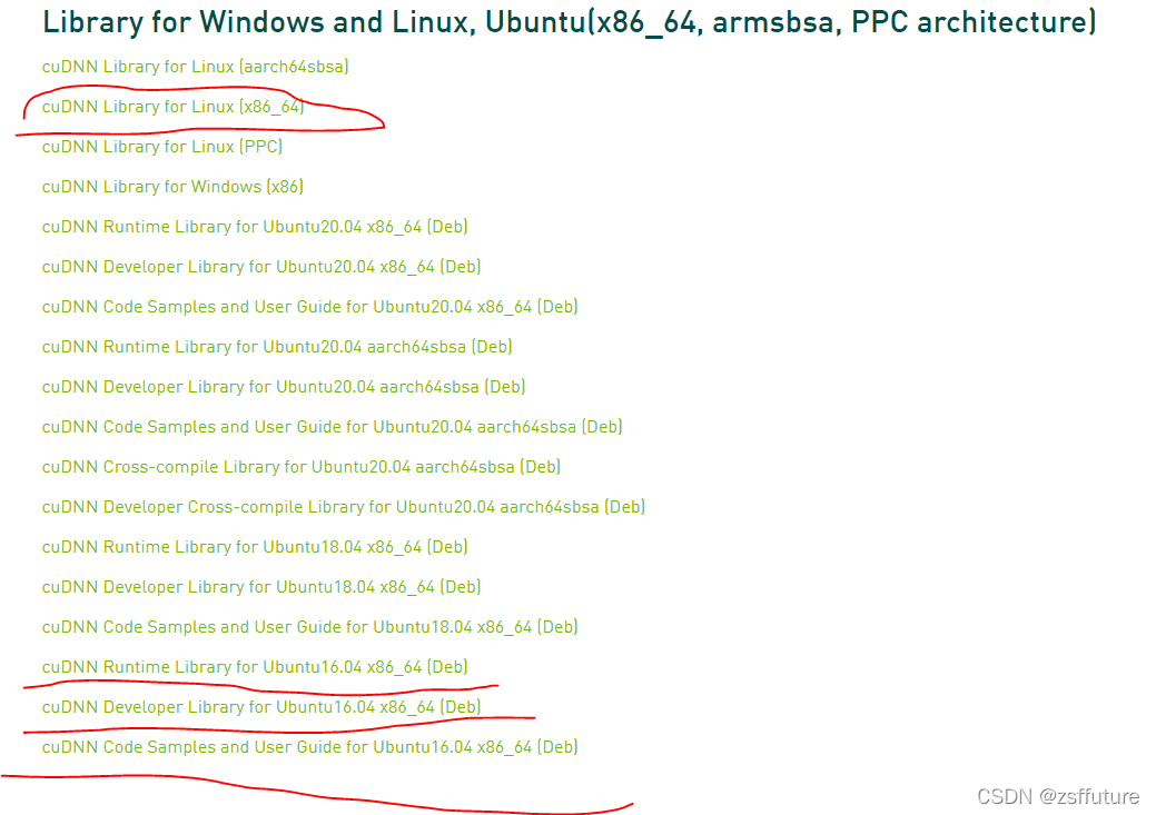 直接下载第一个即可: 需要安装 cuDNN Library for Linux (x86_64),也就是上图第一个: