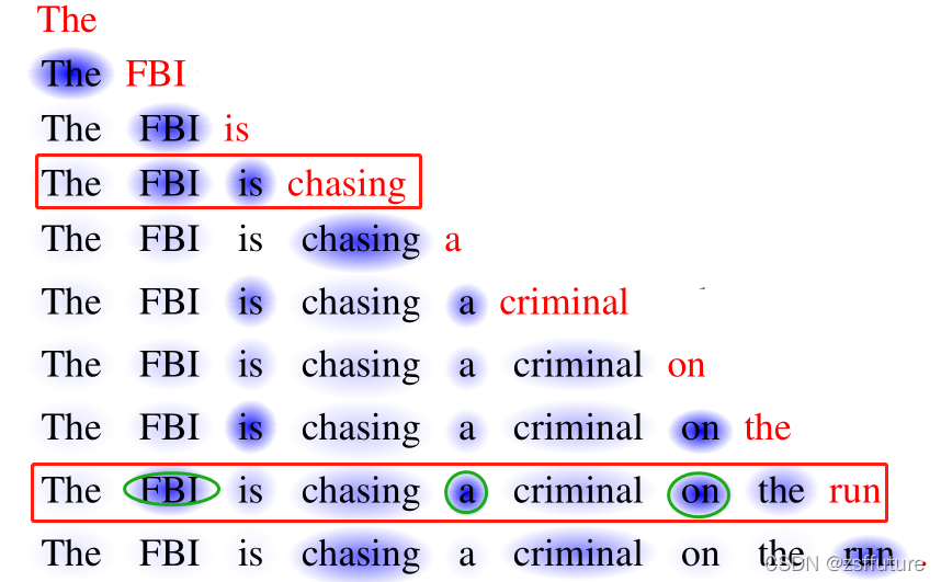 红色单词是输入,蓝色部分是相关性的值,例如当输入run的时候,计算当前的C的时候,使用当前的h和之前的状态计算相关性,发现和FBI、a、on相关性比较大