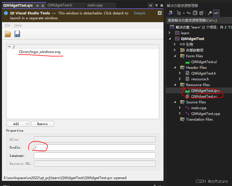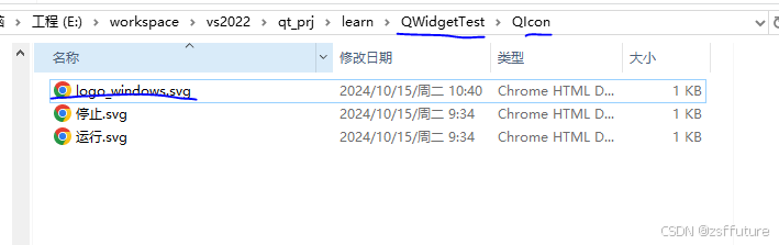 首先将图标文件 logo_windows.svg,复制到项目目录 QWidgetTest 下的 icon 目录中,如下: