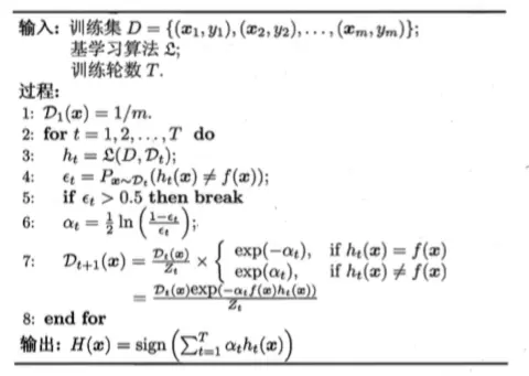 Adaboost算法:先从初始训练集合中训练出一个基学习器,再根据基学习器的表现对训练样本的权重进行调整,使得先前基学习器做错的样本在后续得到更多的关注,然后基于调整后的样本权重来训练下一个基学习器,直到基学习器的数目达到事先指定的数目M,最终将这M个学习器进行加权组合。