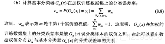 在加权训练数据集中的分类误差率为被误分类的样本权值之和。注意一下,我们定义的基学习器,其