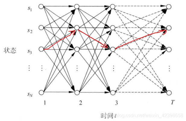 表示状态,即隐马尔可夫总共有N个状态,每一个时刻的状态都是这里面的一种可能情况,因此上图的意思就是横向是时间走向1,2,3,4,,,,T,纵向就是每个时刻的可能选择的所有状态了,也就是说肯定存在一个通路是我们想要的,如上图的红线路径。因此从上图可以看出状态转移的可能输太多了,计算量很庞大,因此使用动态规划解决计算量大问题,使用递归去搜索全局最优解,下面是就是如何推出递归表达式呢?同时这个算法又叫前项算法。