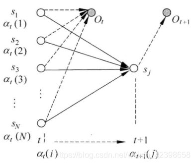 上图代表的意思大家应该都懂吧,这里是时间t到t+1的转移过程,假设在t时刻的中间变量概率为