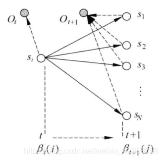与计算前向变量一样,可以用动态规划的算法计算后向变量。类似地,在时间t状态为