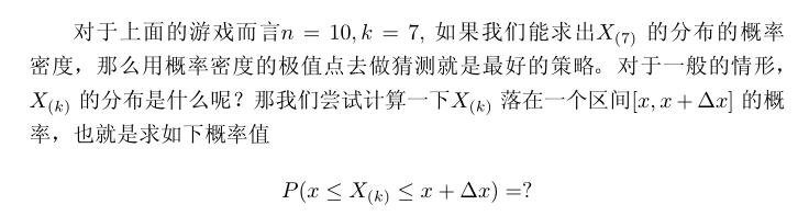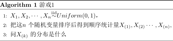 这里简单的讲一下背景,详细请参考文档,游戏的规则很简单,我有一个魔盒,上面有一个按钮,你每按一下按钮,就均匀的输出一个[0,1]之间的随机数,我现在按10下,我手上有10个数,你猜第7大的数是什么,偏离不超过0.01就算对。”你应该怎么猜呢?