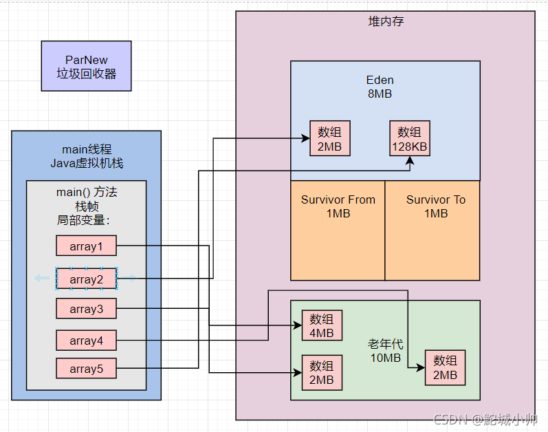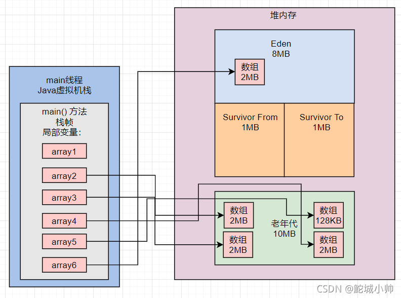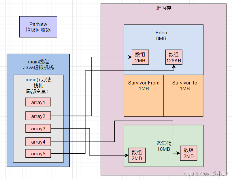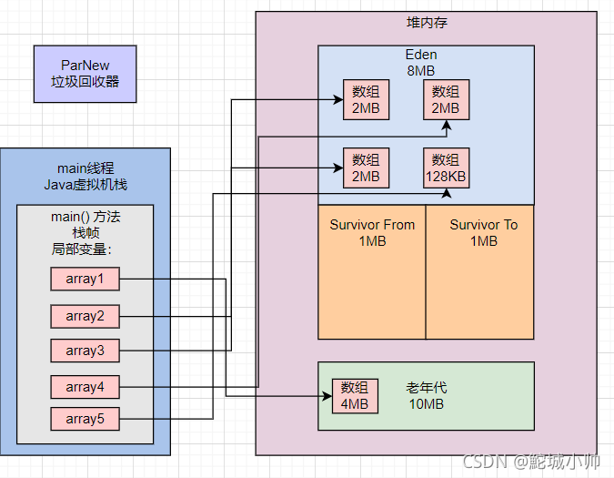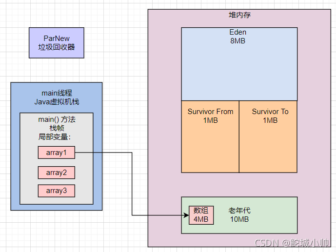 (1)4MB的大对象Array1给分配内存空间时直接进入老年代,此时不会有GC。因为老年代10M可连续的空闲空间;