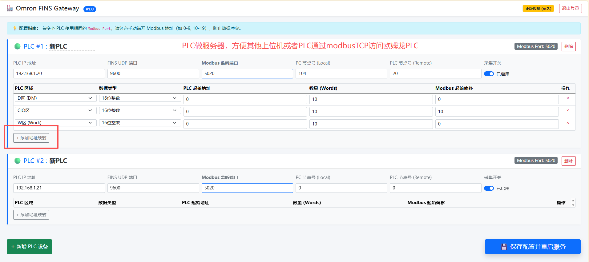地址映射灵活:可以将 PLC 杂乱的地址(如 D100, W5.0, CIO20)映射为连续规整的 Modbus 地址(40001~40010),方便上位机批量读取。