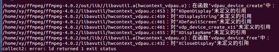 /home/xy/ffmpeg/ffmpeg-4.0.2/libavutil/hwcontext_vdpau.c:432:对‘XCloseDisplay’未定义的引用