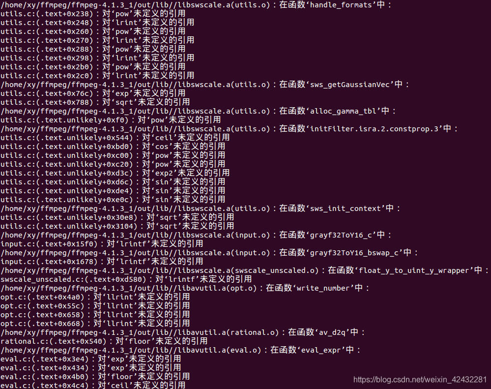 博客主要记录了FFmpeg编译过程中遇到的未定义引用问题及解决办法。如对‘pow’‘lrint’未定义引用,编译时加 -lm;对‘uncompress’等未定义引用,加 -lz;对‘XOpenDisplay’等未定义引用,加 -lX11;对‘vdp_device_create_x11’未定义引用,加 -lvdpau。