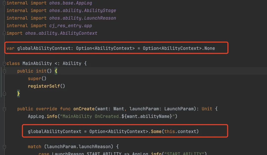 它的两个参数分别是应用上下文和数据库的配置信息。主要是应用上下文写起来比较麻烦,首先main_ability.cj文件,定义全局的上下文参数,并且赋值: