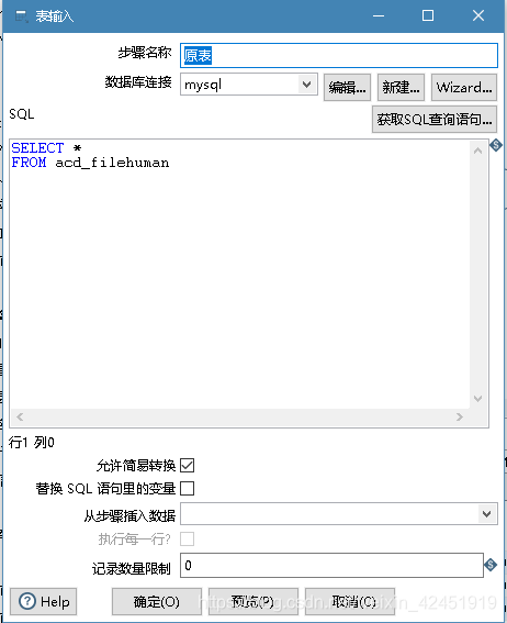 4.添加表输入,编辑表名为原表中要转换的字段名,读取数据字典中的对应表名。