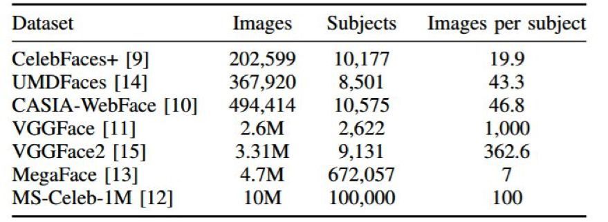 表 1:公开的大规模人脸数据集。
