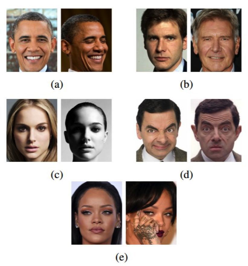 图 1:在自然人脸图像中找到的典型变化。(a)头部姿势,(b)年龄,(c)光照,(d)面部表情,(e)遮挡。