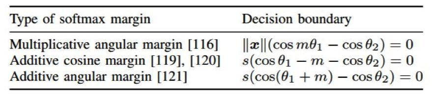 如图 8 所示,这个余量可以有效地增大类别之间的区分程度以及各自类别之内的紧凑性。根据将该余量整合进损失的方式,研究者们已经提出了多种可用方法 [116,119-121]。比如 [116] 中对权重向量进行了归一化以具有单位范数,这样使得决策边界仅取决于角度 θ_1 和 θ_2。[119,120] 中则提出了一种加性余弦余量。相比于乘法余量 [135,116],加性余量更容易实现和优化。在这项工作中,除了归一化权重向量,特征向量也如 [115] 中一样进行了归一化和比例调整。[121] 中提出了另一种加性余量,它既有 [119,120] 那样的优点,还有更好的几何解释方式,因为这个余量是加在角度上的,而不是余弦上。表 2 总结了有余量的 softmax 损失的不同变体的决策边界。这些方法是人脸识别领域的当前最佳。