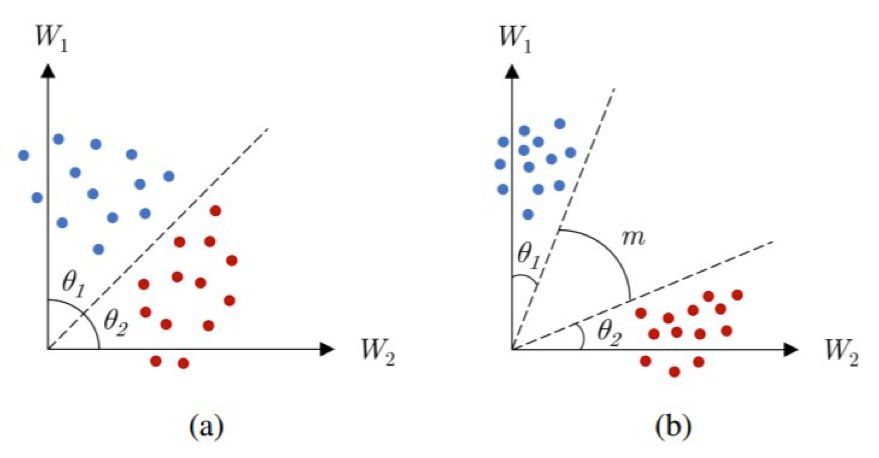 图 8:在两个类别之间的决策边界中引入一个余量 m 的效果。(a)softmax 损失,(b)有余量的 softmax 损失。