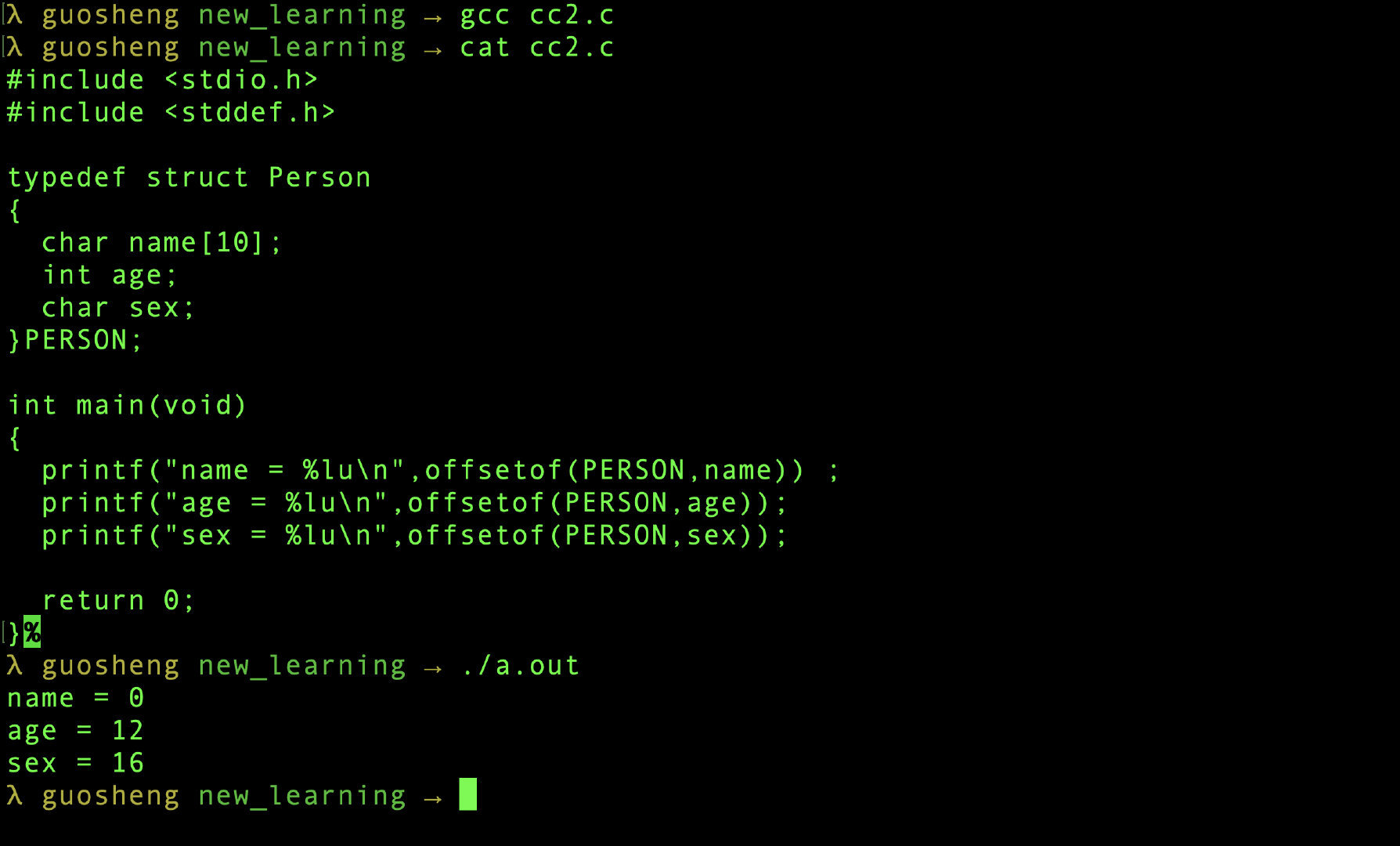 printf("sex = %lu\n",offsetof(PERSON,sex));