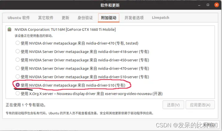 Ubuntu20.04安装之后已经有显卡驱动,但版本较旧,需要更改。
