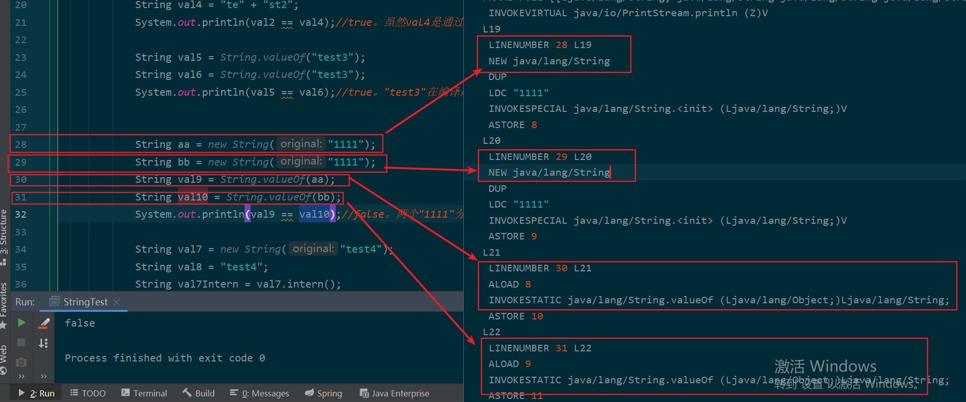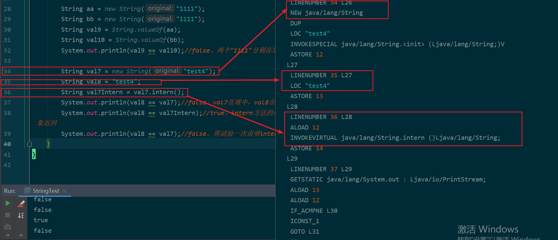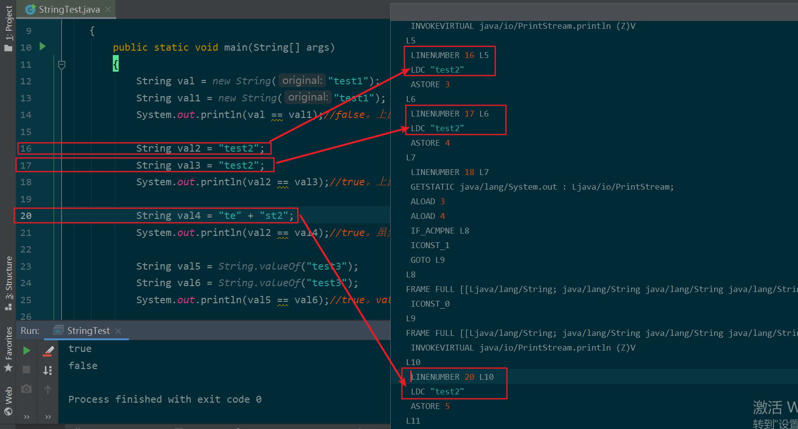 可以看出上面三行都调用了LDC字节码,他表示在常量池中加载字符串,而"test2"这个字符串在编译器会存入.class文件中,因此三者相等