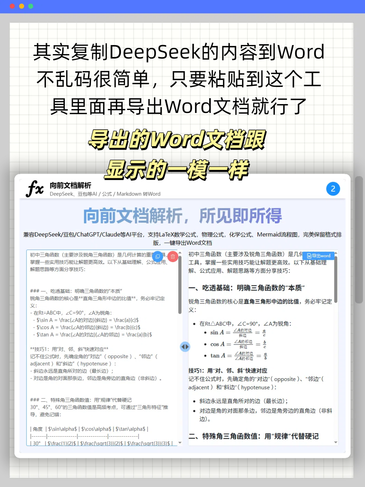 向前文档(或其他专业格式转换工具)支持高精度提取DeepSeek生成的复杂内容,包括数学公式、代码块等。通过其内置的“一键导出Word”功能,可避免直接复制导致的格式丢失或乱码问题。