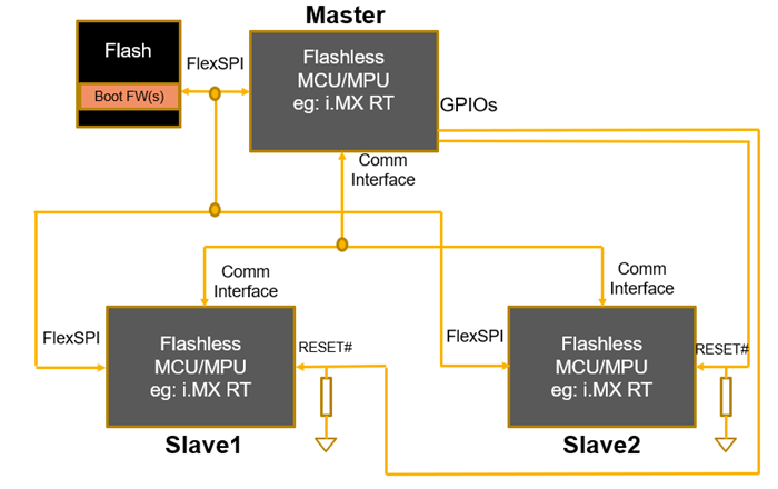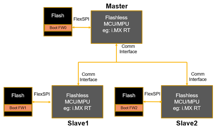有些特殊的客户应用会采用多颗 i.MXRT 芯片设计一主多从的硬件架构(目的不一,或仿多核 MCU 系统、或拓展 GPIO 数量),因为 i.MXRT 片内无非易失性存储器,这时候为整个系统配置合适的启动设备保证每个 i.MXRT 都能加载程序正常启动是头等大事。