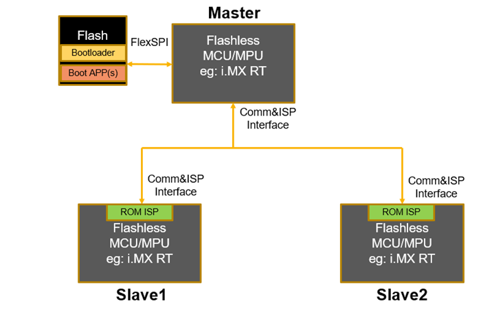 此时我们可以借助 i.MXRT 的 ROM ISP 功能,由主 i.MXRT 先启动运行 Flash 里的 bootloader ,然后由 bootloader 来读取 Flash 里的应用程序并通过 ISP 接口直接加载到从 i.MXRT 的内部 SRAM 里运行(多个从 i.MXRT 可按序串行下载也可并行下载,从 bootloader 设计角度来说一般是按序串行下载),当然这种方式同样有明显的优缺点: