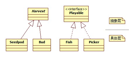 我们分别以“莲蓬”类和“鱼”类为基础,抽象出了“收获”抽象类和“嬉戏”接口。抽象类和接口舍弃了原始类中的具体内容,但保留了系统的关键特性(收获与嬉戏的乐趣)。
