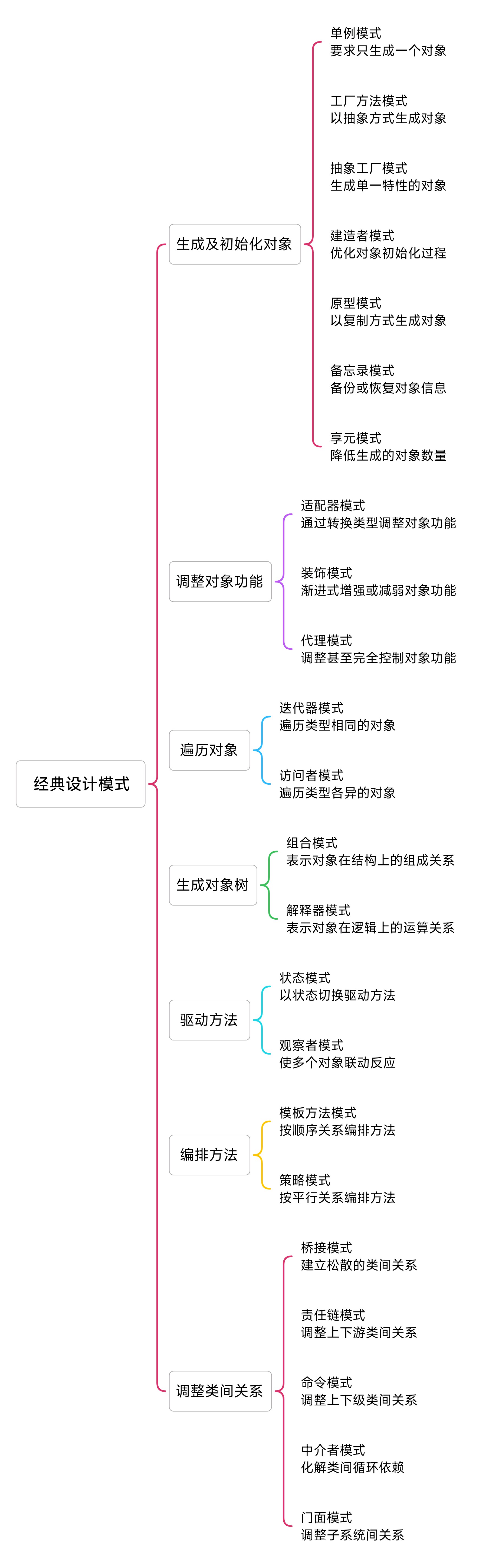 原著中作者将设计模式分成了创建型、结构型与行为型三种类型,由于这种分类方法具有一定的迷惑性,这里不再采用。