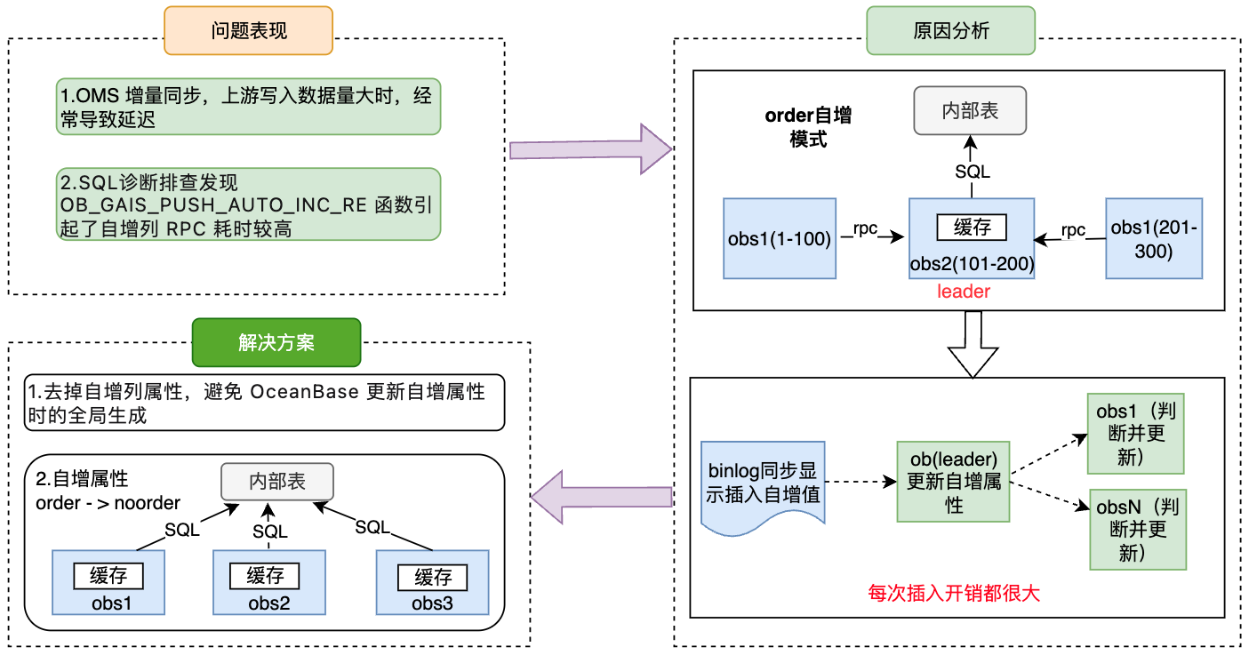 比如,当leader 分发任务给 OBServer 1去更新其自增属性时,同时OBServer N也可能需要更新自己的自增属性,它们都会向leader发起请求,从而导致大量的rpc通信。这种rpc开销会大幅降低插入操作的效率,进而影响整个系统的性能。