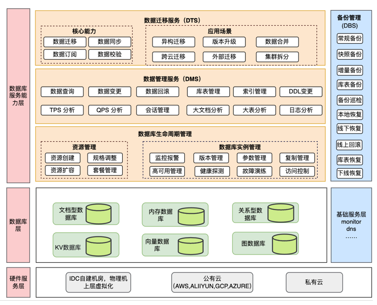 第二层是数据库层。在硬件服务层之上,我们构建了强大的数据库服务层。这一层提供了多种类型的数据库服务,包括文档型、内存型、关系型、KV型、向量型以及图数据库,全面满足不同的数据存储与处理需求。