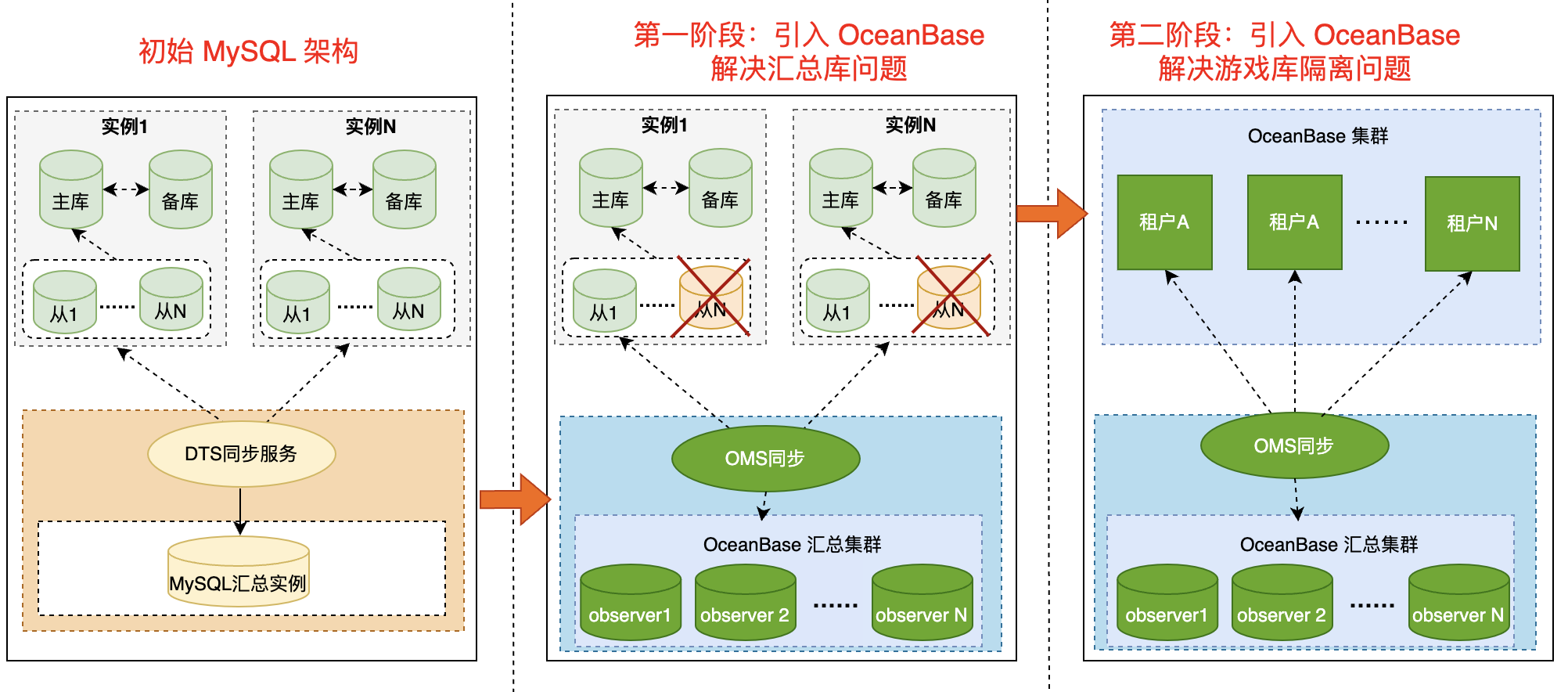 在第二阶段,计划使用OceanBase解决游戏库隔离问题。我们充分利用OceanBase的租户隔离功能,以满足业务间尤其是多游戏间的隔离需求。为此,直接在上游将多实例迁移至OceanBase,通过多租户模式实现资源隔离。对于汇总查询,也是由OceanBase来完成。