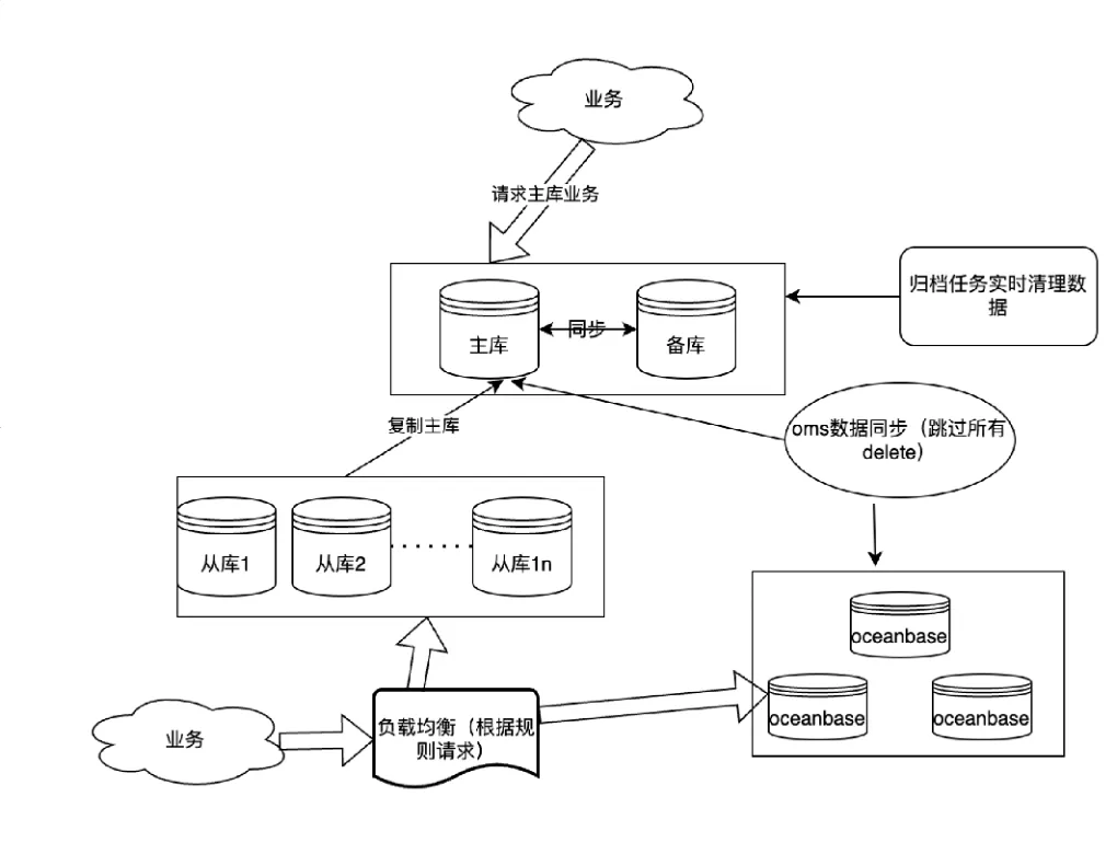 在引入OceanBase的第一阶段,我们计划采用其解决汇总库问题。使用OMS将汇总数据的处理迁移至OceanBase。同时,在上游流程中,削减部分重库资源,直接将更多请求导向OceanBase处理。