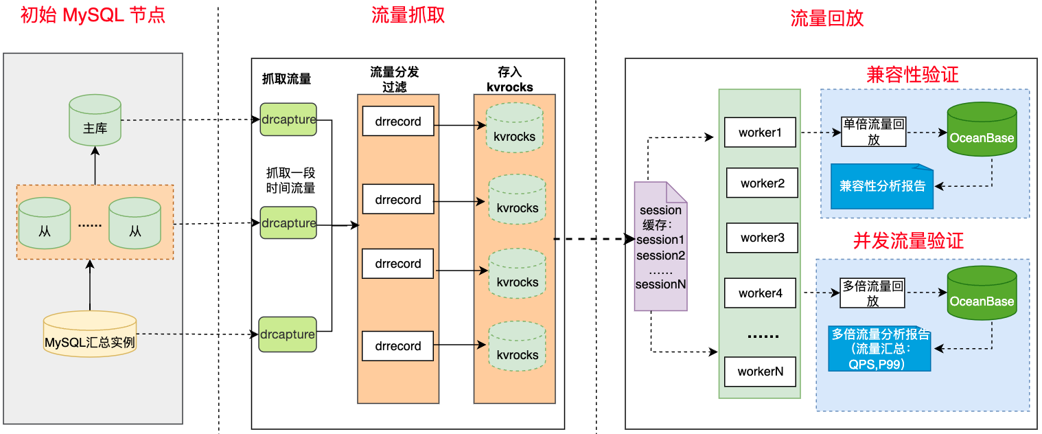 流量抓取完成后,进入流量回放阶段。回放主要分为两个方向:一是兼容性验证,二是并发流量验证。我们会根据缓存的session级别来分发流量,确保流量被准确地发送到不同的worker中进行回放处理。