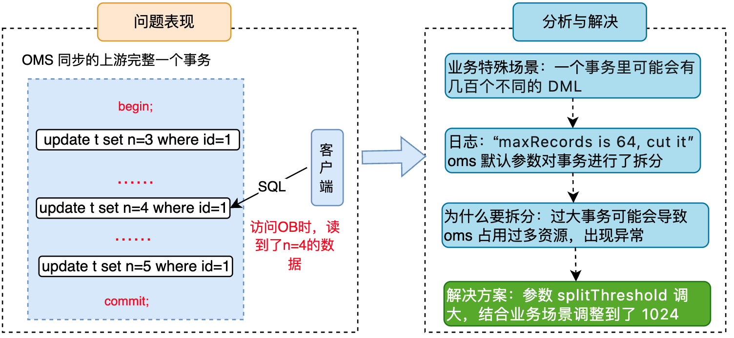为什么要在OMS中进行拆分呢?其实,这是因为当一个大事务进行同步时,可能会消耗OMS过多的资源,甚至导致一些异常情况的出现。为了避免这种情况,我们通常会对大事务进行限制和拆分。
