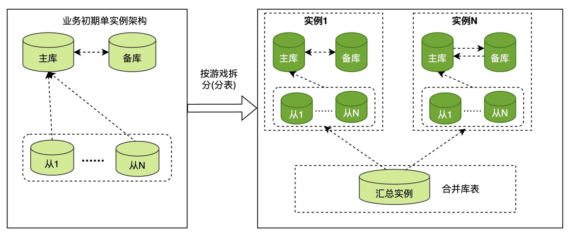 基于底层的DB SaaS服务,以一个游戏周边的服务为例,业务初期我们采用单实例主备从的架构模式。随着接入的游戏数量不断增加,这种架构已无法满足日益增长的请求需求。因此,我们决定对数据库进行拆分,比如将一个实例拆分成多个实例,以应对这一挑战,如图 2 所示。