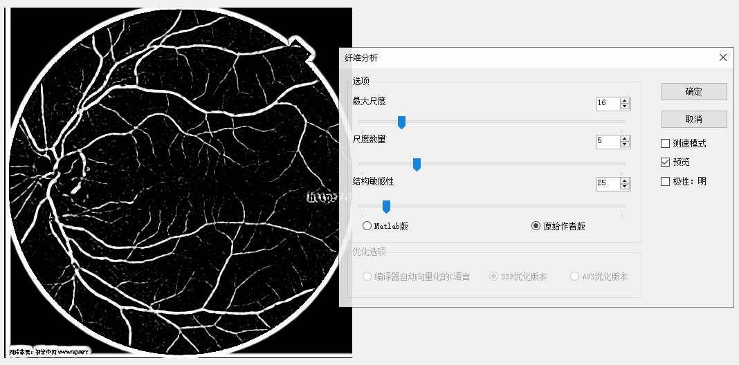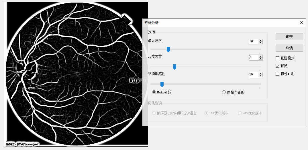 本文Demo下载地址: https://files.cnblogs.com/files/Imageshop/SSE_Optimization_Demo.rar,本算法位于Detection(检测相关)--》 FiberMetric(纤维分析) 菜单下,里面的所有算法都是基于SSE实现的。