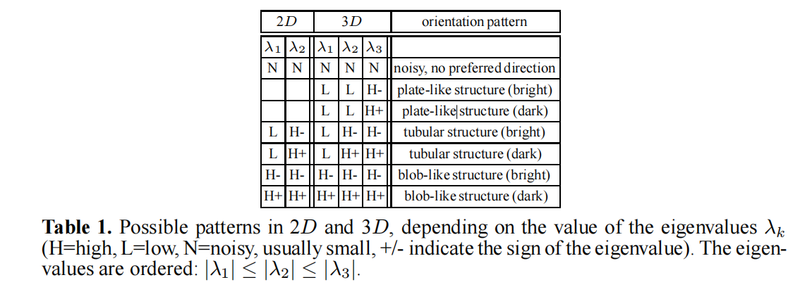 但是说实在的我没有看明白原理,懵懵懂懂的,反正大概就是知道通过判断Hessian矩阵的两个特征值之间的某些关系可以确定某个位置是否属于血管或者说管状结构,我觉得呢大概看懂论文里这个表可能就比较好了: