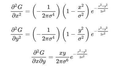 这里所谓某个尺度下图像,就是对原始图像进行该尺度的高斯模糊后得到的图像,在所有的可搜索的博文或者代码中,我们都看到了大家都是按照论文作者提供的matlab代码的方式,直接根据高斯模糊卷积核的公式,先求出其3种二级偏导数的理论计算公式,然后在根据公式取求取卷积的结果,直接得到二级偏导数,即如下过程: