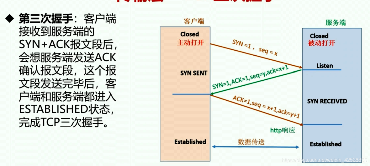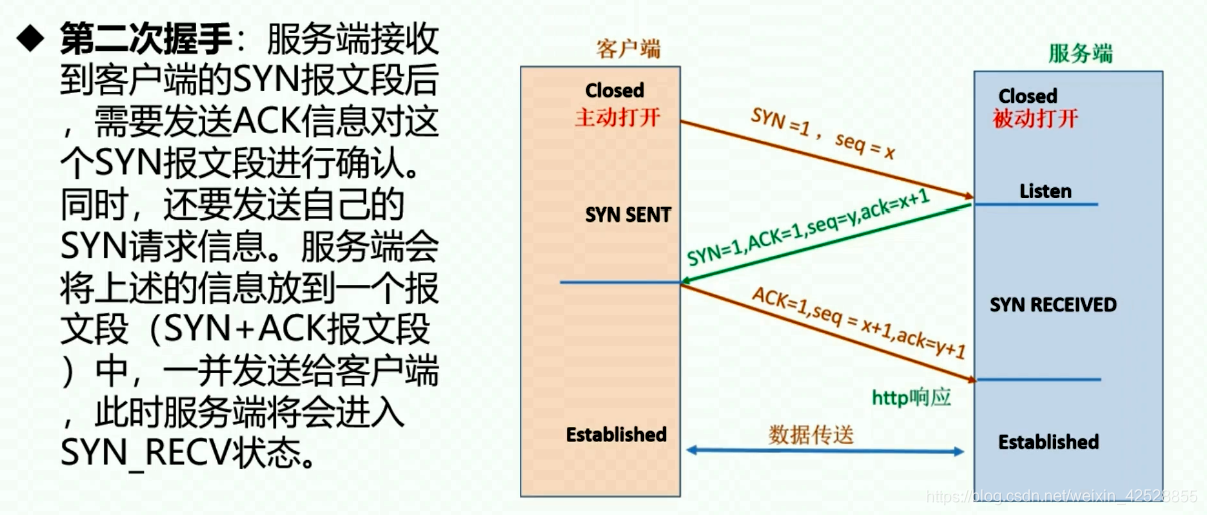 第二次握手: 服务端发送 确认包 和 请求包 ,客户端接收到后, 客户端就能确认:客户端自己 和 服务端 的 发送和接收能力 都正常【但服务端不知道 自己的发送能力 和客户端 的接收能力 是否正常】