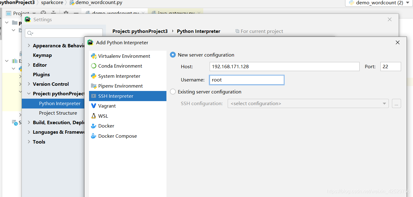 pycharm 新建项目,添加如下远程 ssh interpreter 解释器,输入连接要连接的host 和username