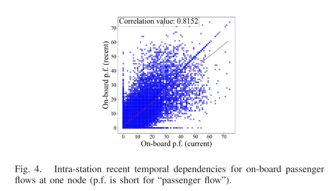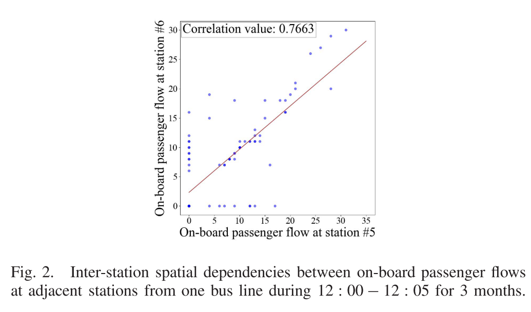 a)站点间的空间相关性,从直观上看,邻近公交车站的客流应该具有很强的空间相关性。我们对同一公交线路的一对相邻站点在一定时间间隔内三个月的客流进行分析,其空间相关性较强,如图所示