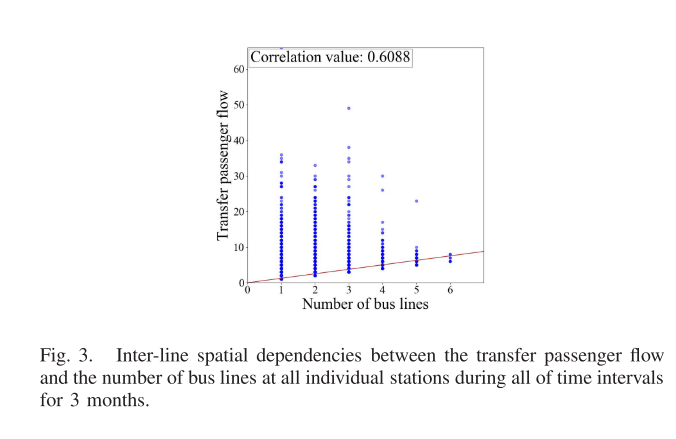 不仅仅包含站点之间的依赖,同时还包含独特又复杂的路线之间的依赖关系。其中站点之间的依赖不仅存在相邻站点之间也存在与较远但功能接近的站点之间(例如一个旅游景点和另一个景点之间)。线路间依赖关系受线路间换乘的影响,可以反映了线路间客流的变化。