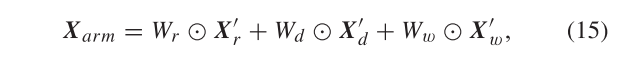 将最近时间步,日时间步,周时间步数据流结果进行融合,公式如下